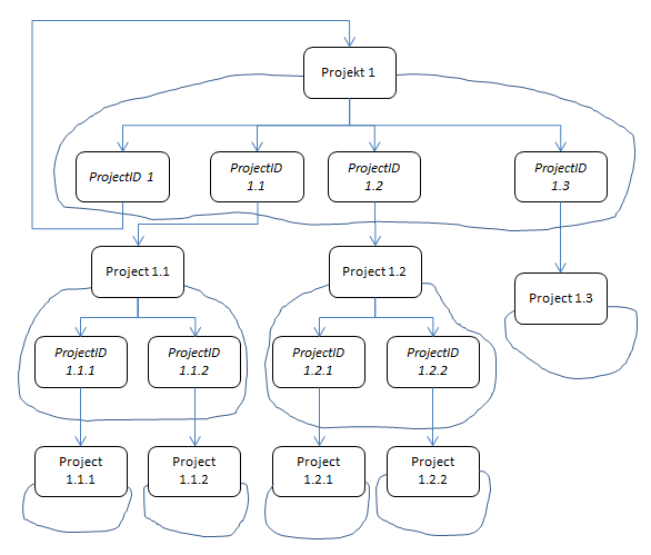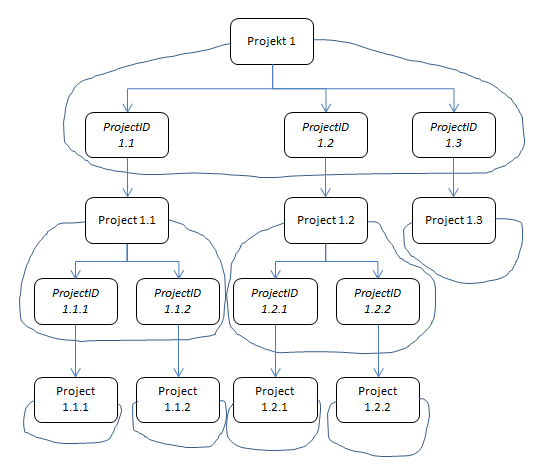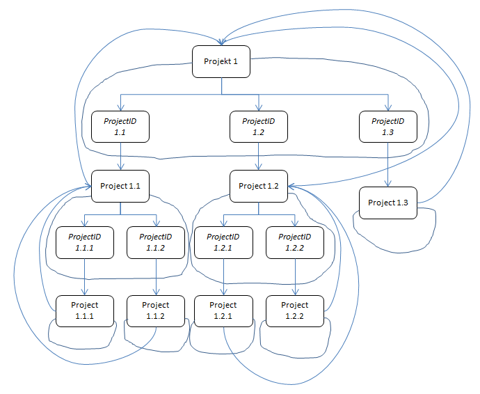 Datenbank-technisch baut man so eine Baumstruktur auf. Die Herangehensweise scheint auch recht natürlich: Als Verantwortlicher eines Projektes lege ich ein Teilprojekt an, das auf mich zeigt. Ab dann wird es aber unnatürlich. Ich weiß nämlich nichts mehr vom Teilprojekt sobald die Aktion fertig ist. In dem Modell von oben weiß das Teilprojekt nichts vom übergeordneten Projekt - was ist also besser? Gucken wir uns mal eine Regel an: