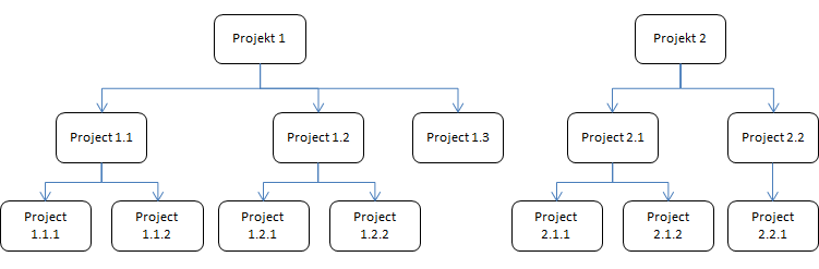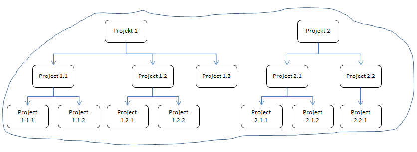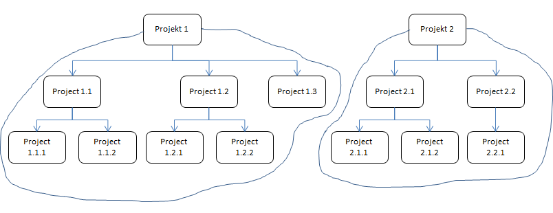 Was hat das denn wieder auf sich? Es gibt in diesem Modell keine separaten Projektstrukturen, die vorhanden Projekte in eine Baumstruktur bringen. Die Struktur ist Teil des Projektes. Das ist im Grunde eine sehr natürliche Herangehensweise. Ein Organisationsleiter kann ein Hauptprojekt anlegen, es auf mehrere Teilprojekte unterteilen, und diese abgeben. Er bestimmt die Teilprojektstruktur unter dem Hauptprojekt. Das Teilprojekt kann dann aber komplett an jemanden anderes abgegeben werden15).