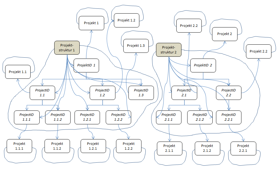 Was noch nicht geht ist, dass die Teilprojektleiter unabhängig von einander die Strukturen bestimmen können. Ein weiters Problem entsteht, wenn man z.B. die Referenz auf Projekt 1.2 aus der Projektstruktur 1 in die Projektstruktur 2 unter die Referenz auf Projekt 2 hängen möchte12). Man müsste alle Referenzen unter der Referenz auf Projekt 1.2 ebenfalls mit rüber nehmen, also die Referenzen auf die Projekte 1.2.1 und 1.2.2. Es gäbe also 6 Schritte: