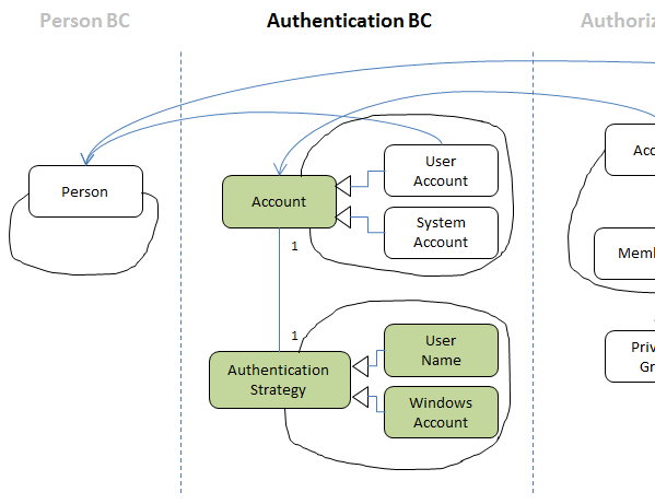• dann müssen die Ereignisse die Strategie betreffend von der Aggregate Root an die Strategie weiter geleitet werden, da das AggregateRoot sie gar nicht kennt und nicht weiß, was damit anzufangen ist. Dafür müssten sich die Strategie Ereignisse alle ableiten von z.B. AccountAuthorizationStrategyEvent, und die Apply-Methode im AggregateRoot für diesen Basistyp würde wissen, es an die Strategie zu übergeben.