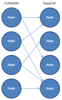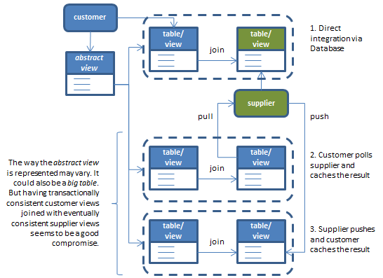 In a situation like this the customer will probably poll the supplier, placing its own services on each of the suppliers nodes which can satisfy the requests by going tho the published views. The customer can poll regularly and cache data10), or poll on demand.
