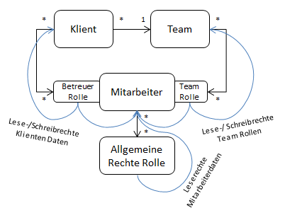 Das Team ist dabei bereits eine Organisatorische Struktur, und vielleicht darf der Teamleiter neue Mitarbeiter zuordnen, und somit auch alle Mitarbeiter der Einrichtung sehen dürfen, ein Berater im Team darf aber nur die Mitarbeiter in seinem Team sehen. Er soll aber vielleicht nicht sehen dürfen, wer Bezugsbetreuer der Klienten ist - das ist vielleicht dem Teamleiter vorbehalten2).