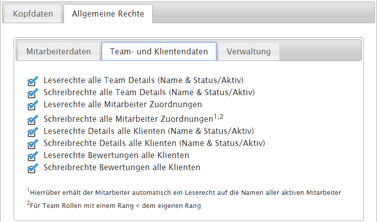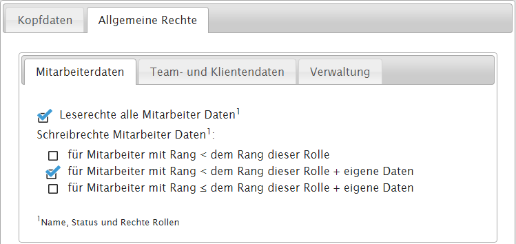 Wenn ein Mitarbeiter Einrichtungsleiter ist, und keine Schreibrechte auf die eigenen Daten hat, und auch Teamleiter mit Schreibrechten auf die eigenen Daten, dann wäre der Einrichtungsleiter höherrangig als der Teamleiter, und der Mitarbeiter sollte keine Schreibrechte auf die eigenen Daten haben. Hier gilt aber nicht das Recht des höchsten Rangs. Für das Schreibrecht auf die eigenen Daten gilt, dass der Mitarbeiter dieses Recht über irgend eine beliebige Rolle erhält, unabhängig davon, welche Rechte er über höherrangige Rollen noch erhält.