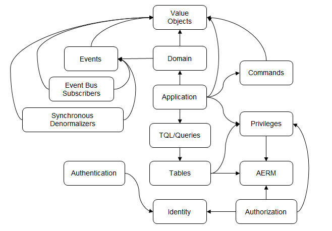 The Domain consists of Aggregates. An Aggregate is comprised of an Aggregate Root, Entities and Value Objects. Aggregate Roots are the entry point into the Aggregate. They have global identities and contain entities with local identities inside the aggregate, and Value Objects which do not have an identity. Aggregates are responsible for the implementation of the business logic and for maintaining all invariants of the domain. When applying CQRS and Event Sourcing, Aggregates only have void methods and publish Events. Events are the result of the Domain implementing its business logic. They contain everything relevant to what happened inside the method call, in order for denormalizers to comprehensively build read models from the events and other subscribers to the Events to react to them in other ways.